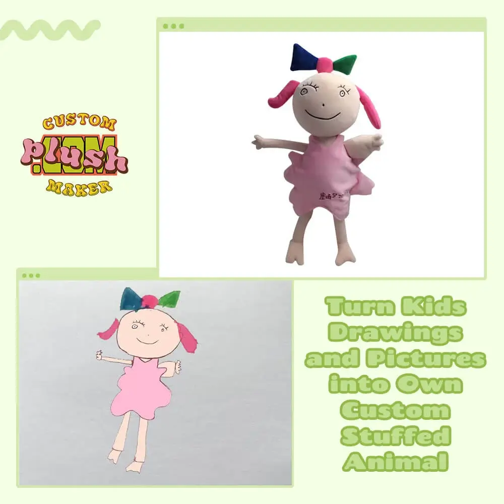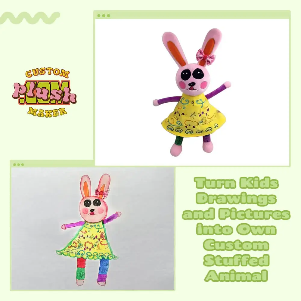 Make your own plushies based on children’s drawings, art, pictures, or personalized designs, transforming stuffed bears, pets, anime characters, horses, and other animals into cuddly companions. Whether it’s bespoke designs, unique characters like bunnies, bunny rabbits, we bring your vision to life by creating custom stuffed animal plush toys that are as unique as your kid’s imagination.